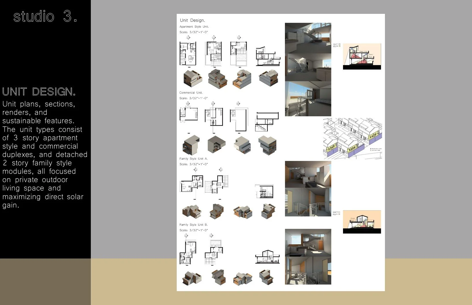 studio 3 focused on passive sustainability. we were tasked with creating a low rise-high density urban housing development using passively sustainable design techniques based on an existing precedent that we researched.